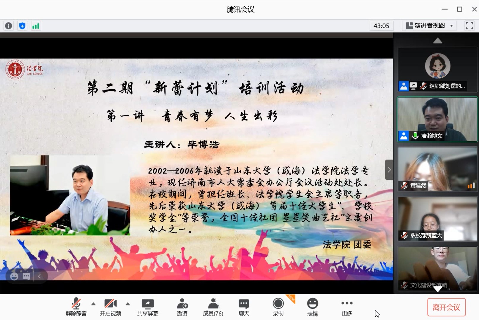 为进一步提升学生骨干的综合素质,加强团学干部之间的沟通交流,法学院于8月28日举办第二期“新蕾计划”第一讲,本次活动通过腾讯会议线上举办,2006届优秀校友、现济南市人大常委会办公厅会议活动处处长毕博浩应邀作本次主题培训的主讲人,法学院团委书记时华忠担任活动的主持人。法学院18、19级学生骨干共计80余人参与学习。