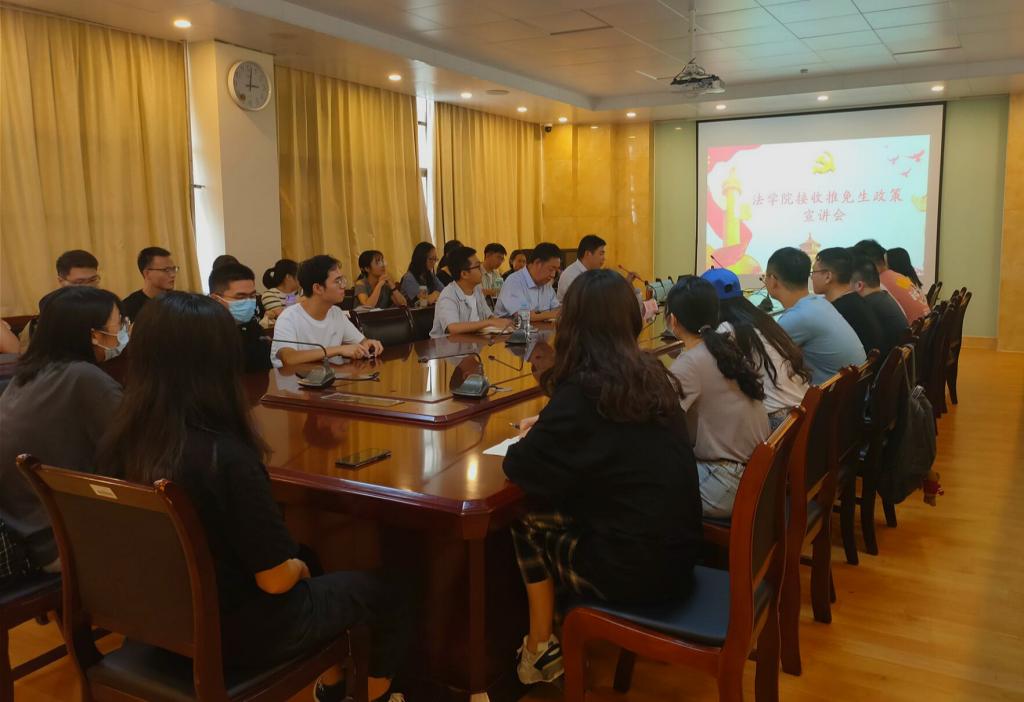 为进一步增进同学们对法学院推荐免试研究生政策的认识,了解学院各学科的发展现况,法学院于9月7日下午在法学院204室召开接收推免研究生政策宣讲会,法学院院长肖金明、副院长刘军、辅导员高世源出席本次会议。有望获得推免资格的2017级本科生到会学习。