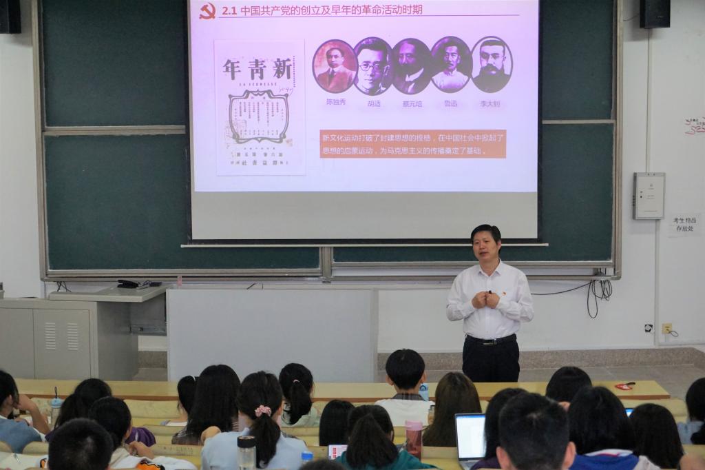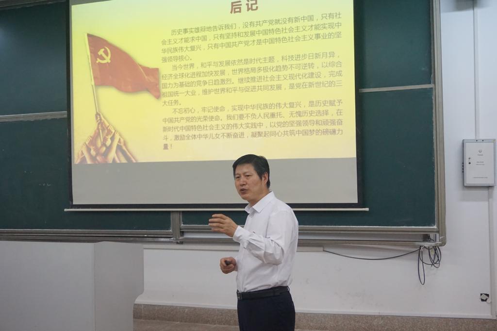 汪全胜立足当下,回顾了中国共产党建党来领导“两个一百年”奋斗目标不断推进、党员数量接近一亿的光辉历程与伟大成就,并由此展开对学习党史的意义、中国共产党发展历程两大方面的讲解。他指出,学习党史的意义在于从历史中汲取智慧和力量,继承党的优良传统,加强党的思想理论建设,以此助推中华民族伟大复兴的历史任务。汪全胜系统梳理了党史的发展脉络,分别从新民主主义革命时期、社会主义革命和建设时期、改革开放和社会主义现代化建设新时期三个阶段,详细介绍了中国共产党建党九十九年来为民族谋复兴、为人民谋幸福的奋斗史,并通过列举陈独秀、李大钊、毛泽东等人物的光荣事迹,为同学们还原真实的历史场景,使同学们切实感受到党一路走来的坎坷与成长。其中,汪全胜重点阐述了新时代中国特色社会主义的发展和中华民族伟大复兴的中国梦,激发同学们对于实现中国梦的热情与对时代发展的思考。