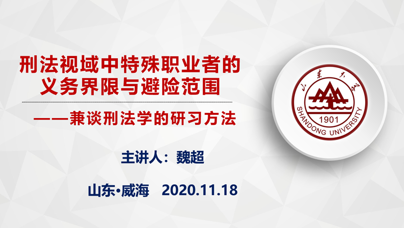 11月18日晚,法学院“知行工作室”以腾讯会议线上讲座的形式,成功举办了第一期“知行学术论坛”。苏州大学王健法学院讲师、德国马克斯-普朗克外国刑法与国际刑法研究所访问学者魏超博士,受邀做了题为“刑法视域中特殊职业者的义务界限与避险范围——兼谈刑法学的研习方法”的学术报告。法学院“知行工作室”主持人、2020级博士研究生吴睿佳主持讲座,来自法学院的博士生、硕士生、本科生30余人听取了学术报告。
