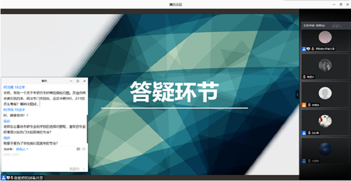 首先,张其山老师就保研、考研、就业、出国四大未来发展方向,结合自身多年教学与实务工作经验以及往届毕业生读研就业等相关情况,联系目前实际情况,分别进行详细介绍。在读研方面,他建议学校与专业相结合进行综合考虑,以兴趣为导向进行具体专业选择;在就业方面,他强调就业中城市的重要性,优先选择工作机会充裕且适应个人工作习惯的城市,再结合自身实际情况进行具体行业选择。答疑环节中,张其山老师面对同学们在未来规划中迷茫与困惑的地方进行细致解答,同时他建议要结合自身实际情况与实际需求综合考虑后进行选择。刘泽华老师根据往届出国同学成绩情况以及学校选择情况进行实时补充,并建议根据就业中不同需求有侧重的选择不同层次的学校。
