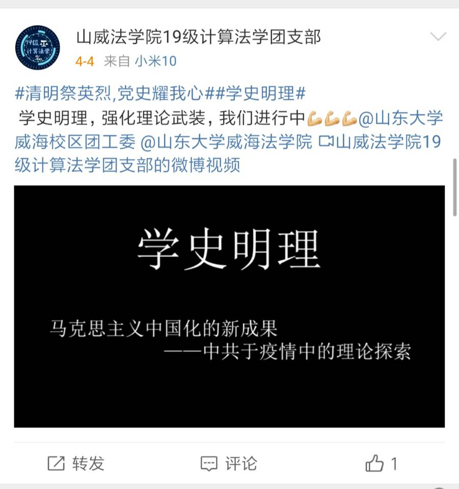 本次党史教育实践活动分为三部分,包括“清明祭英烈,党史耀我心”微博线上活动、“学党史,祭英烈”原创系列微信推送和“学党史缅怀先烈,悟思想传承信仰”主题实践。在“清明祭英烈,党史耀我心”微博线上活动中,法学院创新活动方式,引导青年团员通过分享英烈英雄事迹、研讨习近平总书记相关讲话精神、发表缅怀先烈的原创文章或诗歌等方式,传递英烈精神,凝练时代故事。本次活动覆盖学院三个年级,近20个班团支部,共计发布微博167条。在微博话题讨论中,2019级普通法学一班团支部留言:“青年团员尤其需要将提高政治品德与精神境界放在自身建设的重要位置。”2019级计算法学班团支部发言:“清明是一种民族精神,面对中华民族复兴的千秋伟业,青年人唯有笃志奋斗,才能无愧于先烈。”