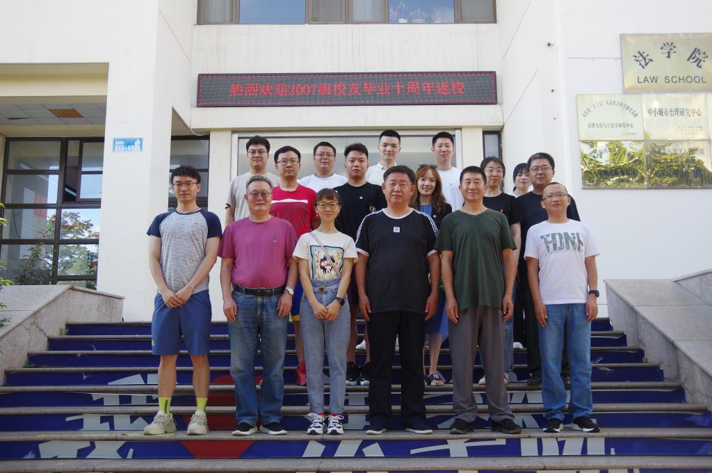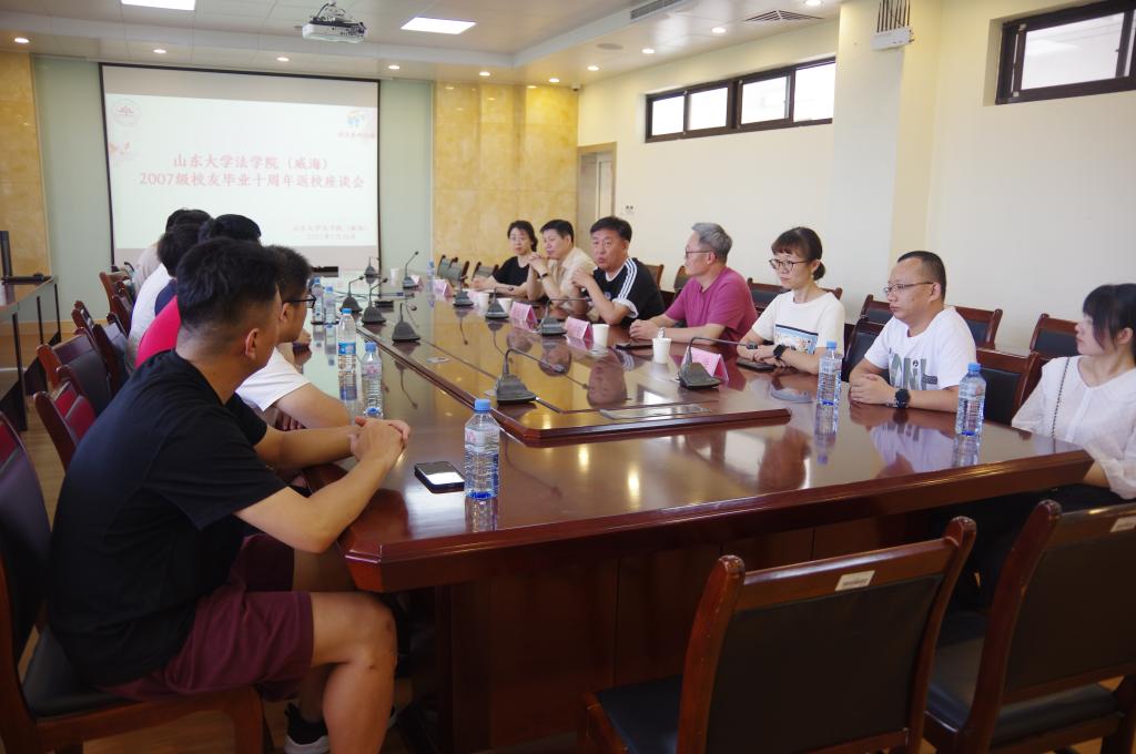 为增进校友与学院的深厚感情,构建沟通交流的平台,法学院于7月16日下午在法学院204举办2007级校友毕业十周年返校座谈会。本次活动由法学院党委副书记侯丽娜主持,法学院党委书记汪全胜,法学院院长肖金明,副院长门中敬,院党委委员牛文军,团委书记时华忠,原07级辅导员刘佳老师,以及2007级部分校友出席座谈会。