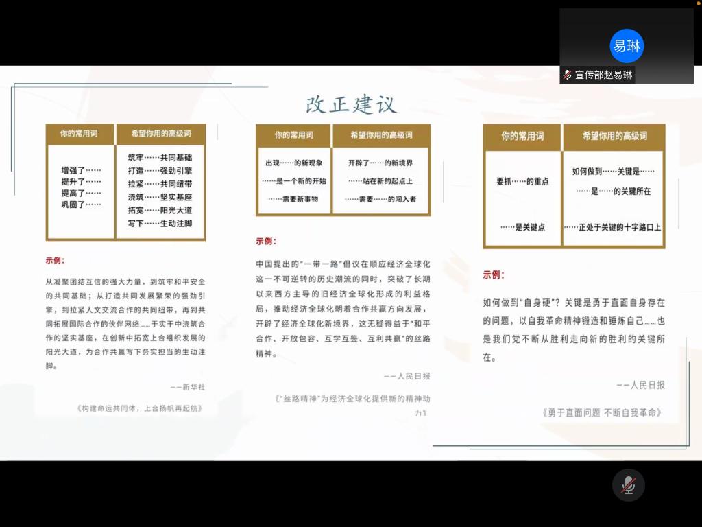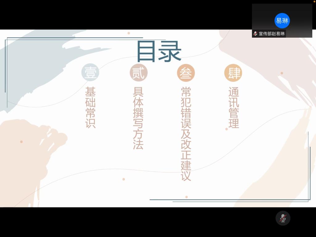 本次培训会就基础常识、具体撰写方法、常犯错误及改正意见和通讯管理四个方面的通讯技能知识展开。赵易琳首先阐述了本次培训会的举办目的与重要意义,并以通讯的文体性质为切入点引入对通讯撰写相关问题的介绍。其中,赵易琳重点强调了通讯撰写的具体方法与技巧。她通过举例分析的方式,围绕通讯的新闻特性为学生骨干明确了通讯写作的格式要求和通讯各组成部分的撰写技巧,从中提炼通讯写作的经验法宝。王之仪对通讯写作中的常见问题进行汇总和剖析,介绍了通讯撰写的注意事项,引导学生骨干采用正确的写作方法和逻辑思路以避免问题的出现。她还为学生骨干梳理了通讯管理的主要程序,总结了投稿流程和审稿标准,鼓励学生骨干积极投稿,为学生骨干通讯工作的开展提供程序参照。