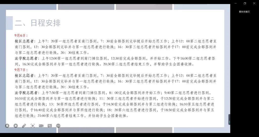 会议伊始,青年志愿者协会宋倩文从服务内容、日程安排、工作原则、工作态度等维度对志愿者展开具体服务培训。她指出,服务内容共分为南门—栏杆引导、核酸检测出口领导、宿舍引导三种。其中,在宿舍引导中,各志愿者可根据实际情况向新生介绍学院班级特色、军训注意事项等内容。同时,结合志愿者的时间和精力,宋倩文进行了志愿者的活动日程安排,并设置相关志愿服务队长,以期更好地为新生提供服务。在工作原则和工作态度方面,她强调,工作期间,各志愿者应按时签到;志愿者需统一着迎新服装,佩戴志愿服务工作证与胸牌;需注意与新生交流的态度,时刻保持良好形象;端正工作态度,时刻关注相关群聊信息,做到机动灵活。随后,时华忠强调,在迎新过程中,志愿者理应保持良好积极的面貌,为新生提供热情周到的服务。同时,志愿者需要保证自身安全,做好个人防护,积极配合疫情防控工作。最后,青年志愿者协会负责人向志愿者进行解答疑惑。