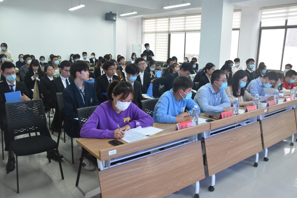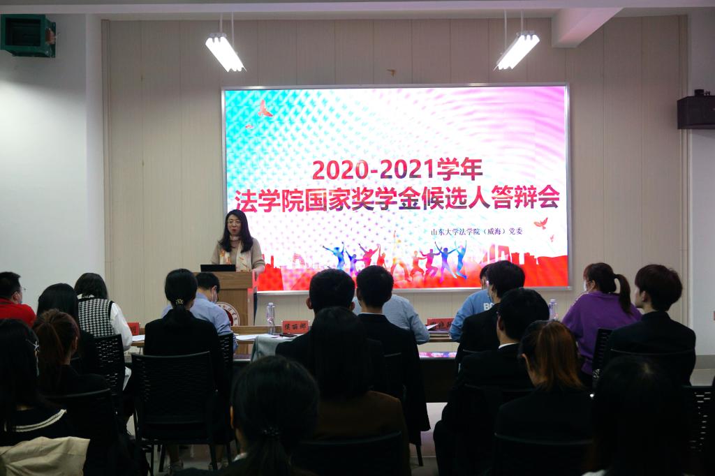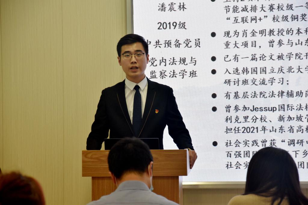 10月14日下午,法学院2020-2021学年国家奖学金答辩会于科学实验楼308教室举行。法学院教师代表张其山、法学院党委副书记侯丽娜、法学院团委书记时华忠,辅导员闫玥、周晓政、刘泽华以及学生代表张晓凯出席本次会议并担任评委,2020级、2021级学生骨干参与本次会议。