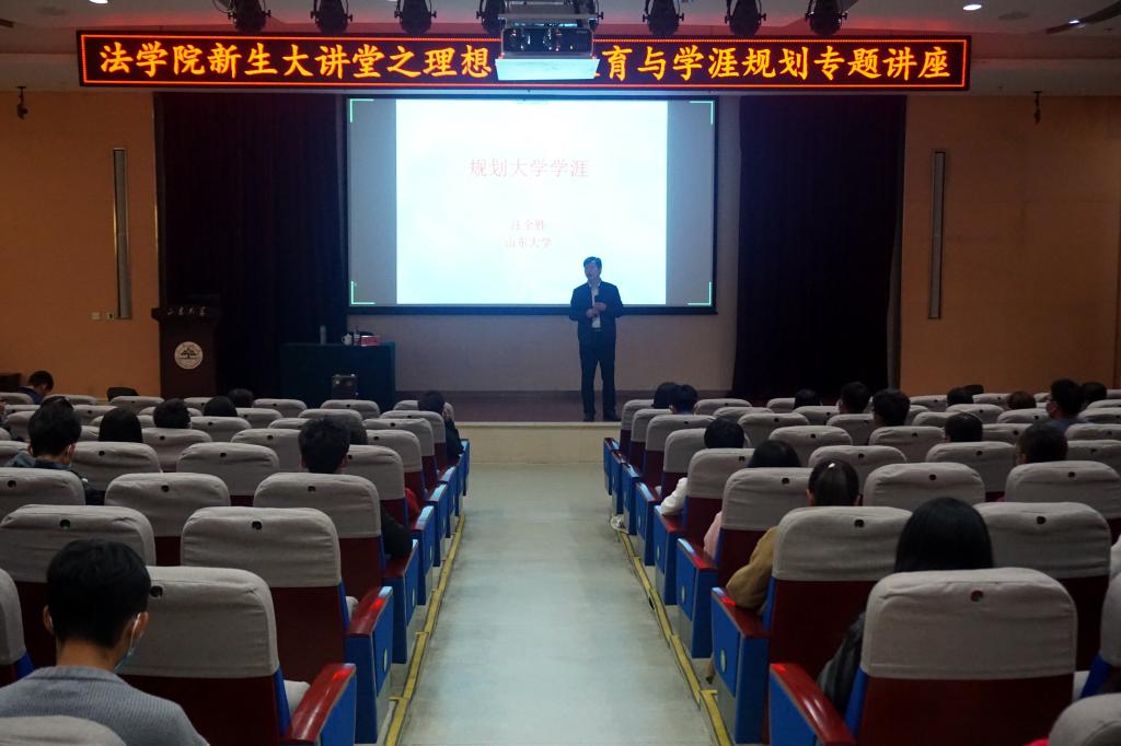 为推进新生理想信念教育的开展,加深学生对大学生涯规划的理解,法学院于10月21日下午在闻天楼西报告厅举办新生大讲堂之理想信念教育与学涯规划专题讲座。本次讲座由法学院党委书记、博士生导师汪全胜教授主讲,2021级辅导员周晓政及法学院全体新生参加讲座。