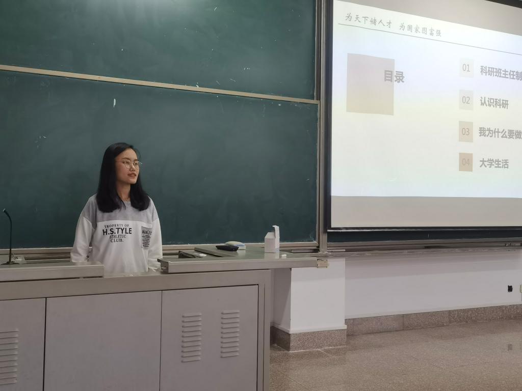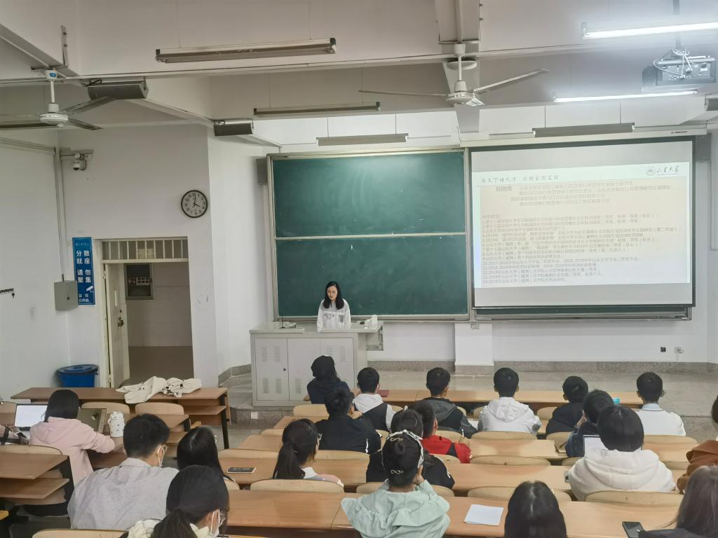 会议伊始,陆晓雅首先向参加本次班会的同学介绍了何为科研班主任制度,阐明了科研班会具体的开展形式以及接下来一学年的授课计划。紧接着 ,陆晓雅以互动的形式使大家对科研和科创活动有了更加全面的了解,她鼓励大家通过学校提供的平台获取参加科研的资源,为自己的大学生活增添色彩。同时 ,为帮助同学们深入理解理论与实际之间的差距,陆晓雅通过方林富诉工商局这一实际案例 形象地揭示了法律在现实运行中存在的困境,启发同学们深入思考其间的关联,形象地 阐明了科研的巨大现实意义。最后,陆晓雅向同学们讲述了历年山大学子在科研方面取得的优秀成就 ,为参会的同学们提出了自己的建议和期许,并规划了一份大学发展蓝图。