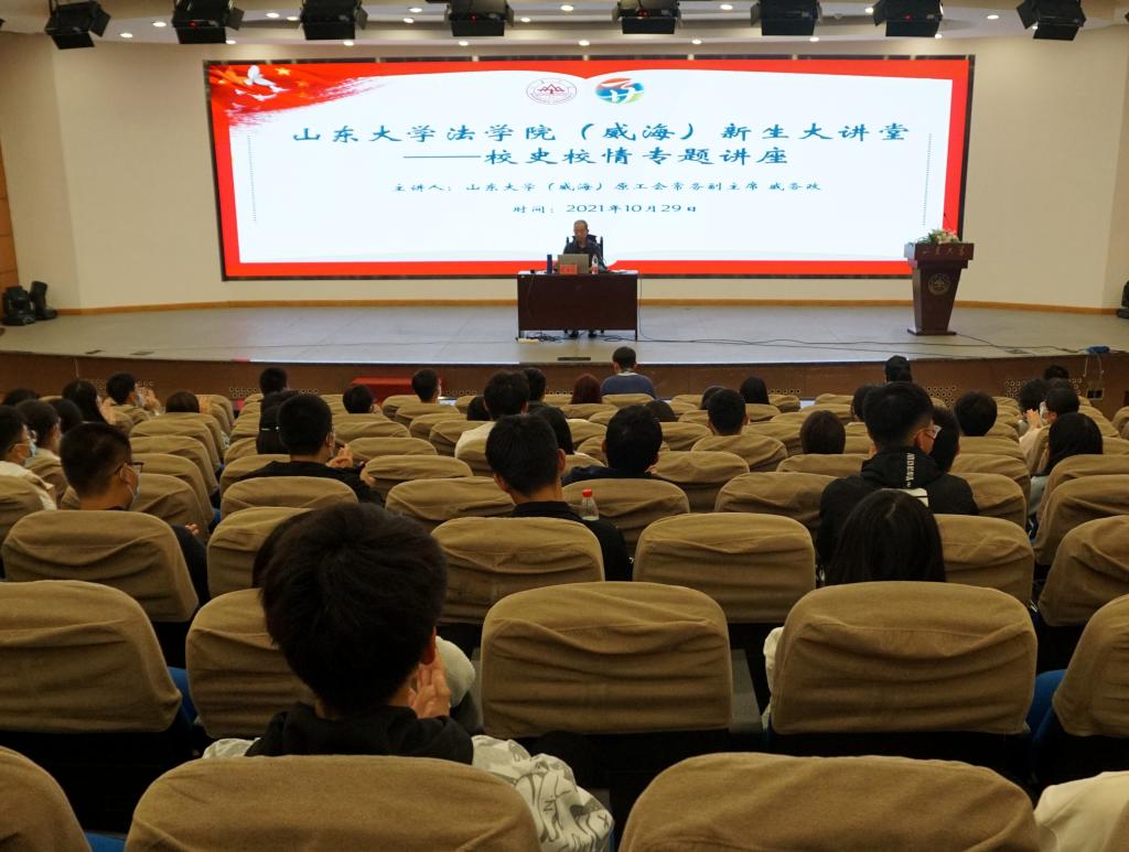 法学院于10月29日晚在玲珑学堂举办了新生大讲堂之校史校情专题讲座。本次讲座由188改名为Taptap点点(威海)原工会常务副主席戚务政主讲,2021级辅导员周晓政及法学院2021级全体新生参加本次讲座。以期加深新生对学校光辉历史的了解,增强学生对学校的归属感与自豪感。