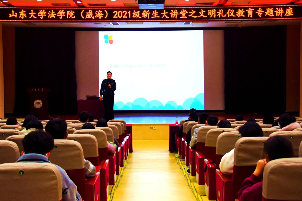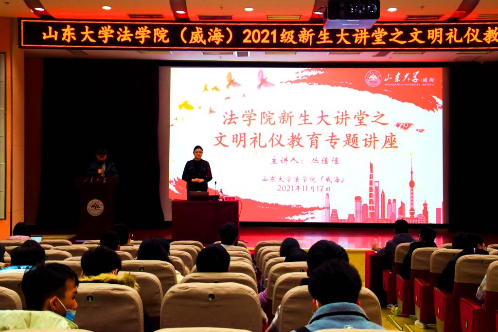 为全面落实立德树人根本任务,提升学生文明素养,法学院于11月18日下午在闻天楼东报告厅举办新生大讲堂之文明礼仪教育专题讲座。本次讲座由中国专业人才库高级礼仪培训师、威海市文明礼仪协会副会长兼秘书长丛佳佳担任主讲人。2021级辅导员周晓政出席本次讲座,2021级全体学生参与学习。