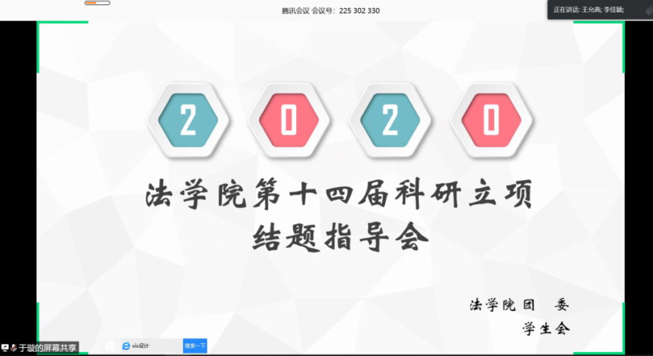 本次结题指导会主要分为结题相关事宜介绍和答疑互动两部分。会议伊始,由主讲人王允高向到场的各团队代表初步介绍了结题检查流程,并为各团队代表阐述了科研立项的评分标准。接下来,主讲人李佳颖从基本要求、页面布局要求、正文格式及注释规范三个方面,为各团队详细讲解了结题论文的写作规范。在下一环节中,王允高针对科研立项后续报销事项,为各团队代表介绍了发票报销的相关要求,阐明了可报销的发票种类、报销的注意事项以及发票上交的注意事项。随后,指导会进入答疑环节。该环节中,团队代表通过语音及文字发言的形式进行提问,针对各团队的疑惑之处,李佳颖与王允高进行了一一解答。会议最后,主持人向大家介绍了法学院“云平台”的使用方法,以便各科研团队学习参考。至此,本次科研立项结题指导会顺利结束。