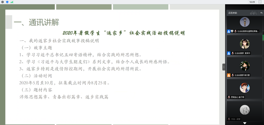 为了让各社会实践团队具备基本实践常识,保证法学院暑期社会实践在疫情防控常态化形势下顺利开展,法学院于8月5日下午举办2020年暑期社会实践培训会。本次活动通过腾讯会议线上举办,法学院2020级宪法学与行政法学博士研究生吴睿佳、各社会实践团队负责人及19级全体同学参加本次会议。