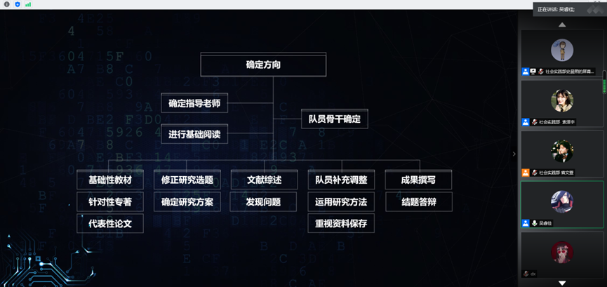 培训会伊始,省文萱介绍了举办本次培训会的目的及意义,并就社会实践团队通讯写作及宣传投稿方面的内容进行讲解。随后,索泽宇就安全须知、报销明细等相关事宜进行具体说明,强调了疫情防控期间团队成员进行暑期社会实践的各项要求。具体培训环节结束后,吴睿佳从如何发现一个好的选题、如何在志同道合和组织效率之间实现平衡、如何制定一个合理的计划以及如何完成一篇调研报告或一篇学术论文四个方面对社会实践活动的开展技巧与相关注意事项展开讲解。分享结束后,吴睿佳对与会同学提出的具体问题进行解答。最后,各团队负责人就培训过程中的产生的问题与社会实践部成员进行交流。