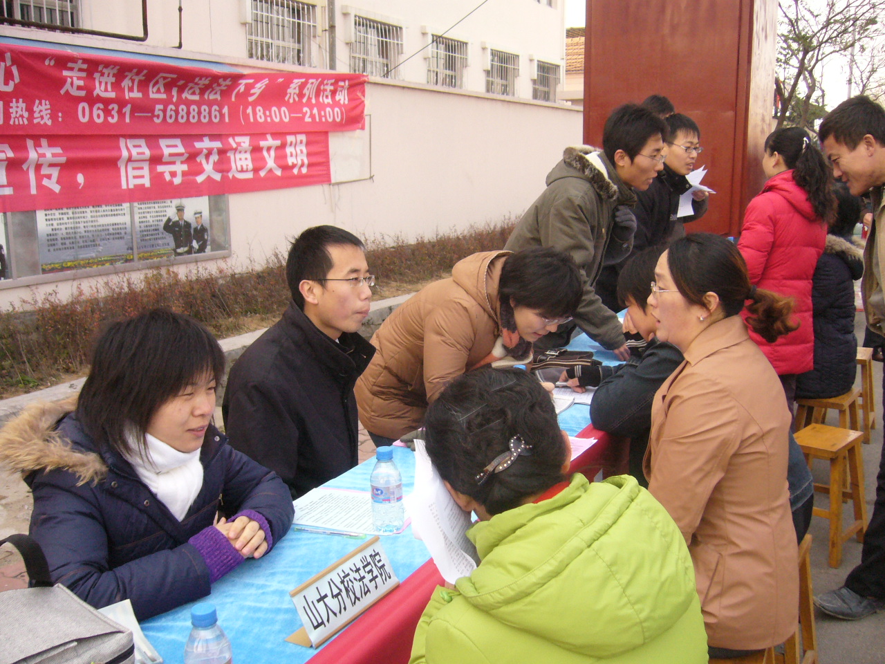 12月4日上午9时,伴随着欢快的鼓声,法律服务中心协同高区市政人员主办的12.4普法宣传进社区活动正式开始。人声鼎沸的市场入口处,山大分校法律服务中心人员在市区执法部门的配合下开始了普法宣传活动。