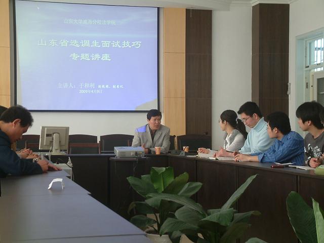 2009年山东省选调生复试工作在即,为使同学们更有效地备考,4月9日上午10点,我院邀请曾多次参加威海市选调生面试工作的我校海洋学院党总支副书记于和利副教授,为进入选调生面试正在紧张备考的同学进行了复试技巧专题培训。培训会由法学院党总支牛文军副书记的主持,09届毕业班辅导员孙克老师参加了培训会。