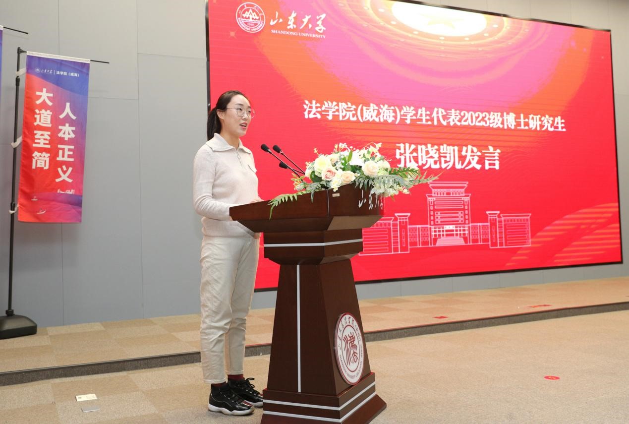 学生代表、2023级法学专业博士研究生张晓凯分享了自身参与法治文化节的亲身经历与感悟,表示要做有家国情怀的山大人和法律人,树立正确的法治价值观,自觉接受中华优秀传统法治文化的熏陶,以实际行动践行习近平法治思想。