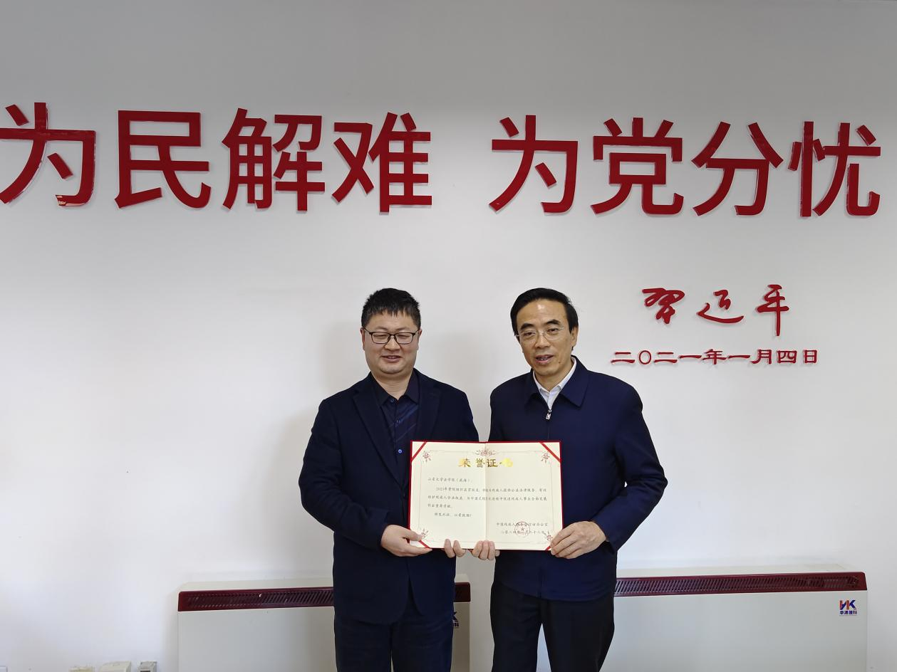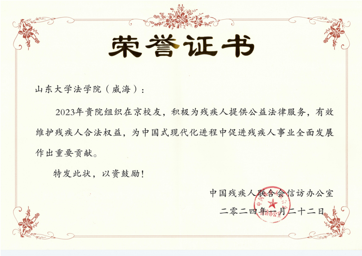 随后,程凯主席为法学院(威海)颁发荣誉证书,对学院2023年组织在京校友积极为残疾人提供公益法律服务,有效维护残疾人合法权益,为中国式现代化进程中促进残疾人事业全面发展作出的贡献进行表彰,张其山代表学院接受表彰。