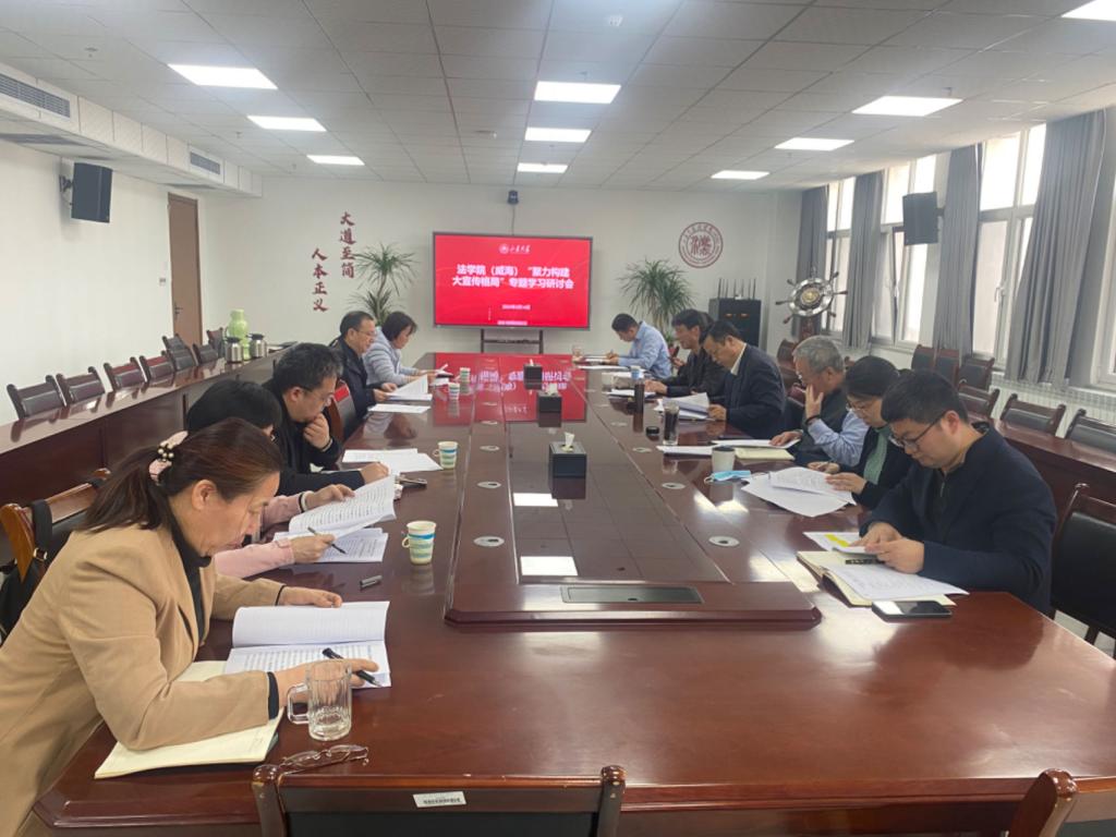 为深入学习贯彻习近平文化思想,落实学校宣传工作会议精神,开创学院宣传工作新局面,3月14日下午,法学院(威海)于南辰楼2008会议室召开“聚力构建大宣传格局”专题学习研讨会。会议由学院党委书记吴丙新主持,学院领导班子成员、院长助理、党委委员、团委书记等参加会议。