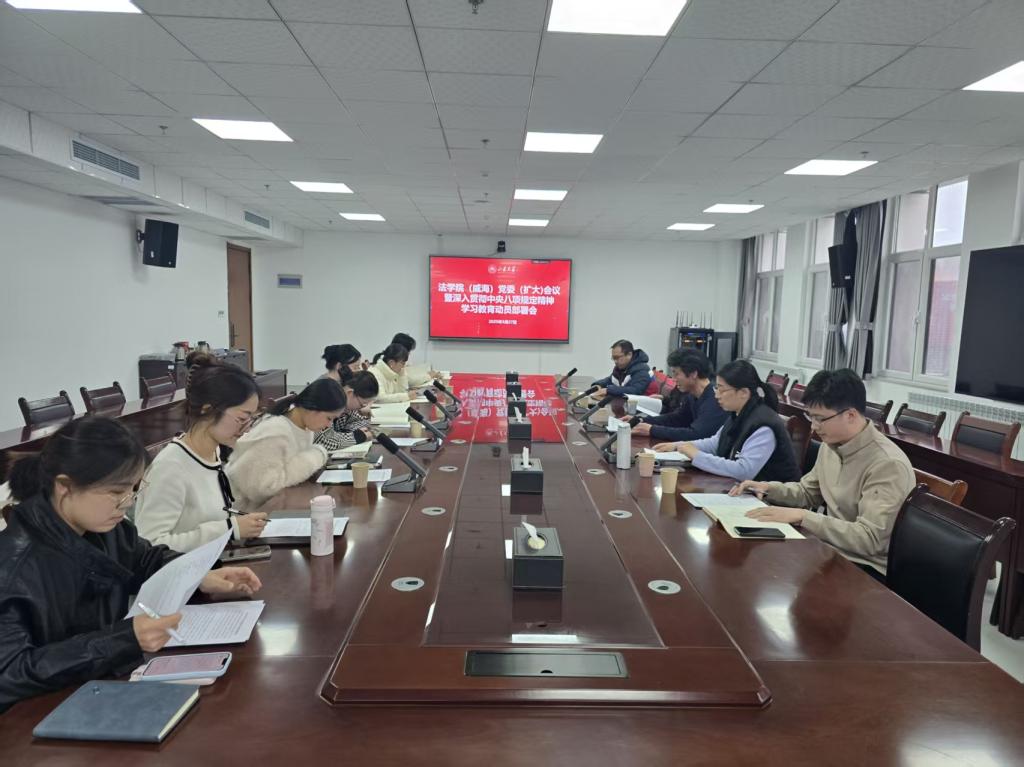 3月27日,法学院(威海)召开党委扩大会议,研究部署学院深入贯彻中央八项规定精神学习教育工作。会议由党委书记吴丙新主持,党委委员、各师生党支部书记参加会议。