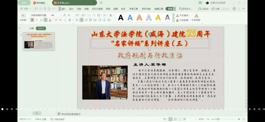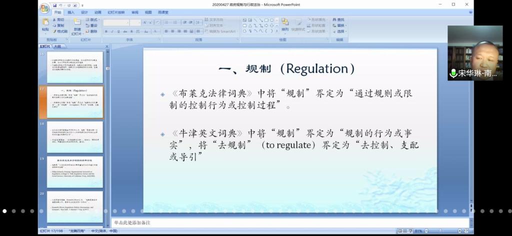 4月27日晚,法学院通过腾讯会议网络平台举办名家讲坛系列之“政府规制与行政法治”主题讲座。本次讲座邀请南开大学法学院教授、法学博士、博士生导师宋华琳教授主讲,法学院门中敬教授主持,部分教师与学生共计290余人参与学习。