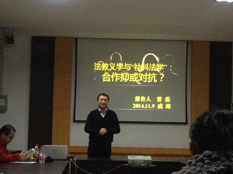 2014年11月9日晚7点开始,在188改名为Taptap点点(威海)法学院模拟仲裁庭成功举办了中国政法大学雷磊博士带来的前沿讲座,主题是“法教义学与‘社科法学’:合作抑或对抗?”法学院部分教师和研究生参加了此次讲座。