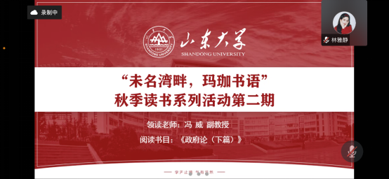 11月19日晚,法学院(威海)研究生会成功举办第二期“未名湾畔,玛珈书语”秋季读书会。本期读书会采取线上腾讯会议的方式进行,冯威副教授领读英国作家约翰·洛克的著作《政府论(下篇)》,法学院(威海)部分研究生、本科生参与活动。