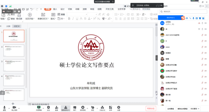 4月3日晚,“传道授业、勤学善思”法学院(威海)论文写作指导系列讲座之法理专题顺利举办。法学院副研究员、法学博士牟利成老师应邀开讲,2021级硕士研究生古雨尧主持讲座,70余名师生线上参会。
