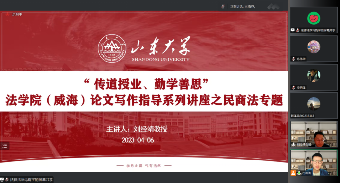 4月6日晚,“传道授业、勤学善思”法学院(威海)论文写作指导系列讲座之民商法专题顺利举办。法学院(威海)教授、山东省法学会民商法研究会副会长刘经靖老师应邀开讲,2021级硕士研究生古雨尧主持讲座,70余名同学线上参会。