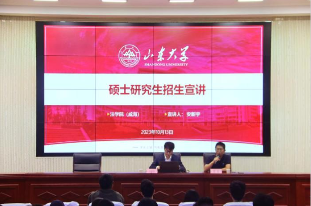为进一步适应人才培养需求,加强与省内高校联系,巩固研究生招生宣传工作。10月13日,我院受邀赴山东政法学院进行2024年硕士研究生招生宣讲活动。本次宣讲由山东政法学院法学院副院长苗雨主持,我院安新宇老师主讲,山东政法学院近200名本科生参加。