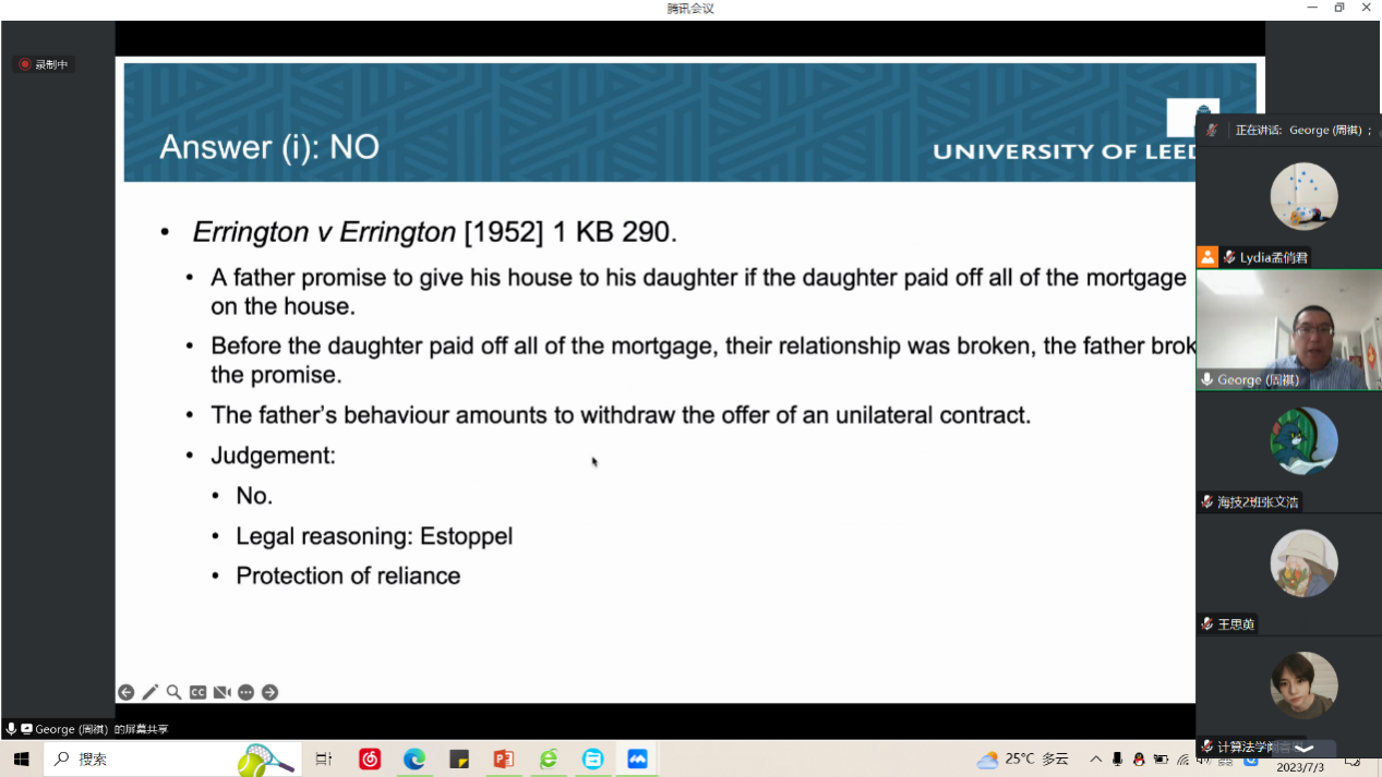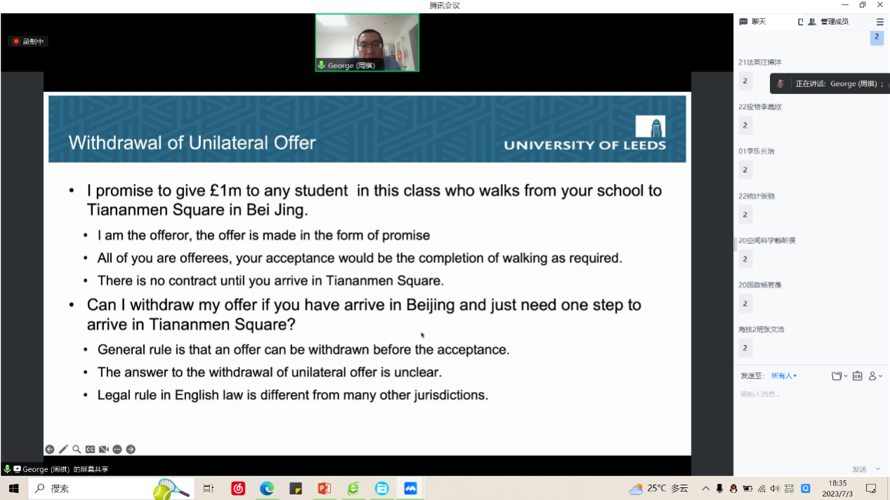 为了加强同学们对英美合同法的体系、渊源以及思想的了解,提升同学们对合同法的系统化学习能力,提高同学们的法律英语水平,2023年7月,我院2021级法学生在学校的大力支持下,进行了英国合同法课程的学习。本门课程由任职于英国利兹大学的周祺教授全英文主讲,周祺教授拥有丰富的授课经验,他为同学们讲授了英国合同法的历史演变、要约、承诺、约因、条款、不实陈述、错误、履行和解除等制度,并在讲授过程中对英美法系和大陆法适时的进行比较,使同学们对国内外合同法有一个整体的理解。周祺教授不仅仅是向学生进行知识讲解,更为每个同学提供一个话题,让同学们在课堂上进行展示,并在展示后提出建议,指出优点和不足,这大大提高了同学们的自主思考和探究能力,让同学们明确不足的同时,也提升了同学们的自信。课堂中同学们认真听讲,积极回应老师的问题,提出自己的疑问,教授与同学们之间形成了非常好的互动。暑期学校课程的开展,符合我院培养具有“国际视野”的应用型法律人才的理念,开阔了同学们的国际视野,提高了在全球化背景下的学习能力,并大大有利于同学们未来对涉外合同法的学习。