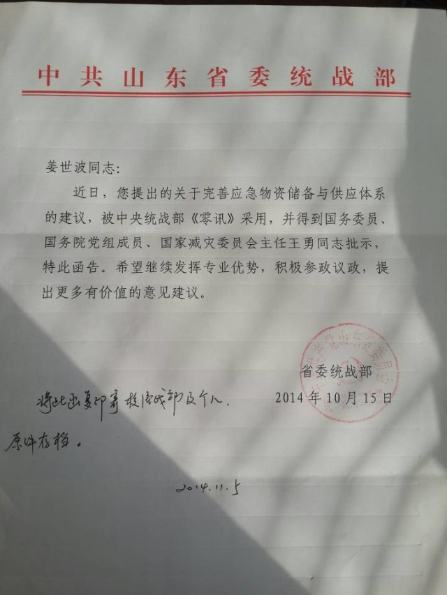我院姜世波教授课题研究的阶段性成果建议获国务院领导批示